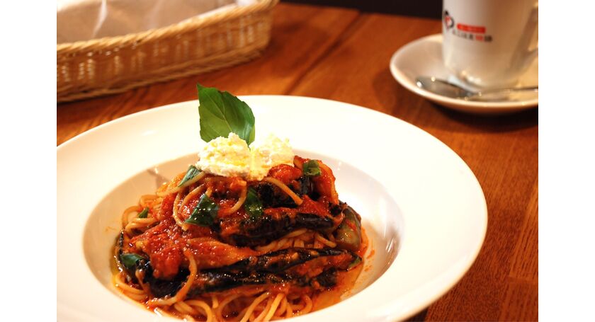 ジューシーで柔らかいナスとリコッタチーズがとろーりトマトソースパスタに絡み、絶品です。